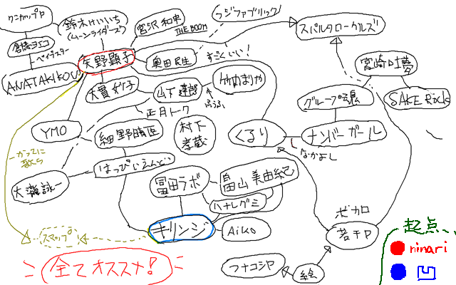 大まかに、聴いているミュージシャン関係のつながり図ができました。