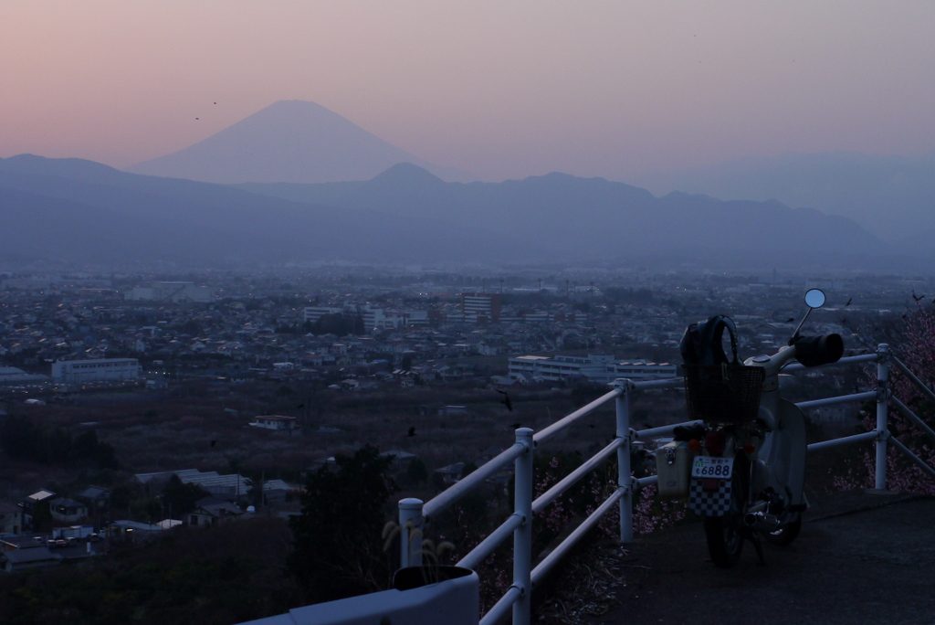 農道から臨む夕暮れ。霞んだ空気でほどよいまどろみ感。すっかり春の陽気。